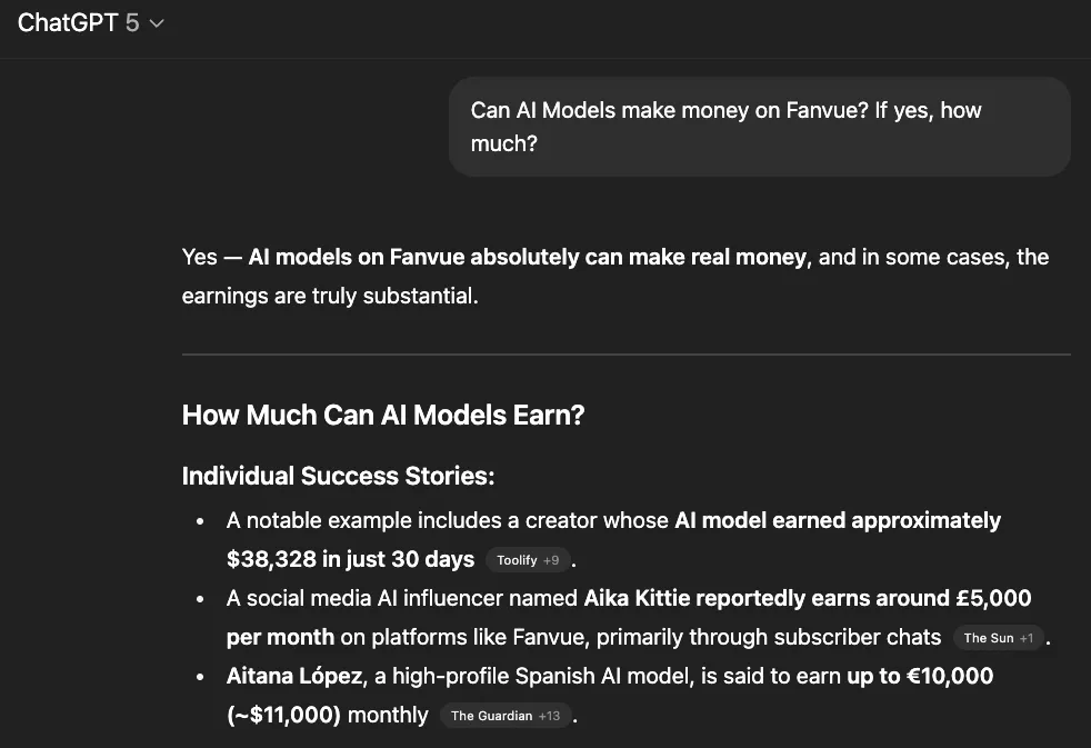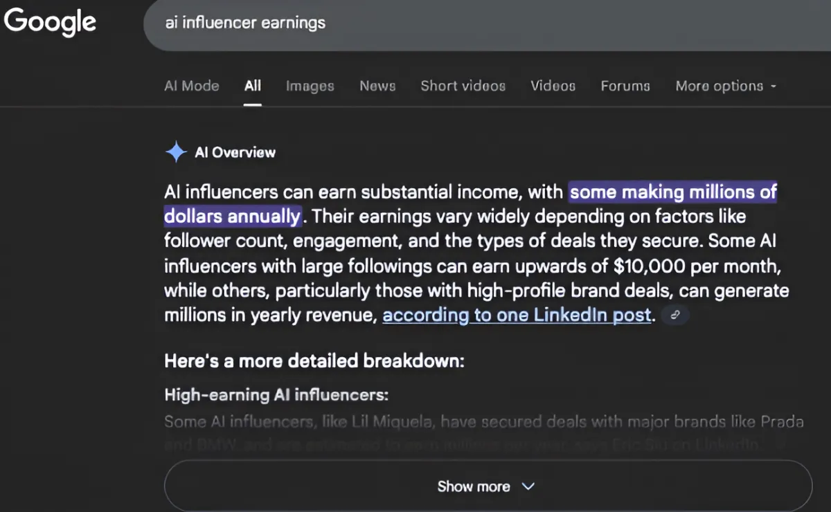Use your favorite search engine or AI platform, and search for "AI influencer earnings". You'll easily see that many new AI influencers make significant profits in the first month.